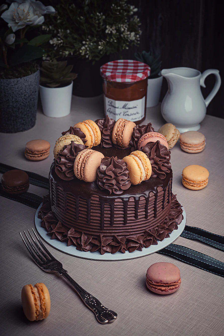 Moist chocolate sponge layered with Belgian chocolate fudge cream, topped with freshly baked assorted mini macarons with chocolate drip