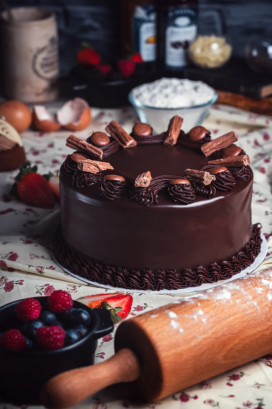 Rich chocolate cake layered with soft chocolate mousse cream, and whipped chocolate ganache, covered in smooth chocolate ganache, topped with flake pieces and ganache piping