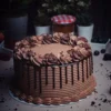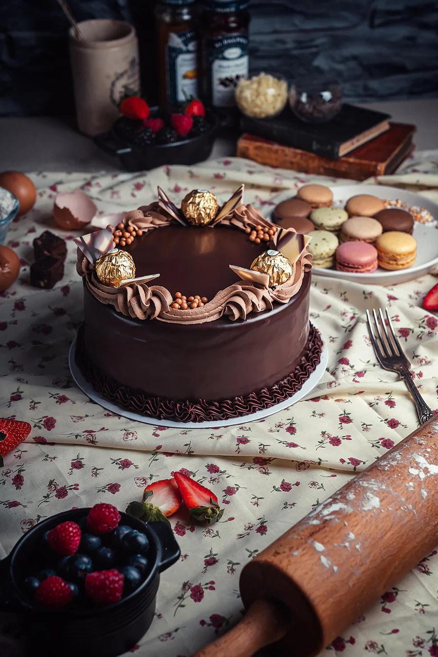 Rich chocolate cake layered with soft chocolate mousse cream, and whipped chocolate ganache, covered in smooth glossy chocolate ganache, topped with Ferrero Rocher’s and chocolate décor