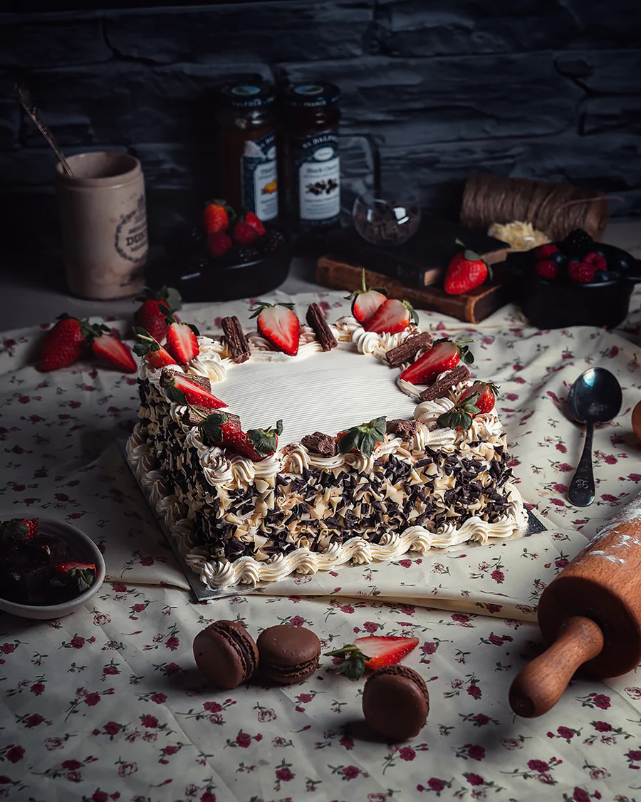 Rich chocolate cake layered with chocolate mousse cream, topped with Belgian chocolate brownies finished with an elegant white and dark chocolate drip
