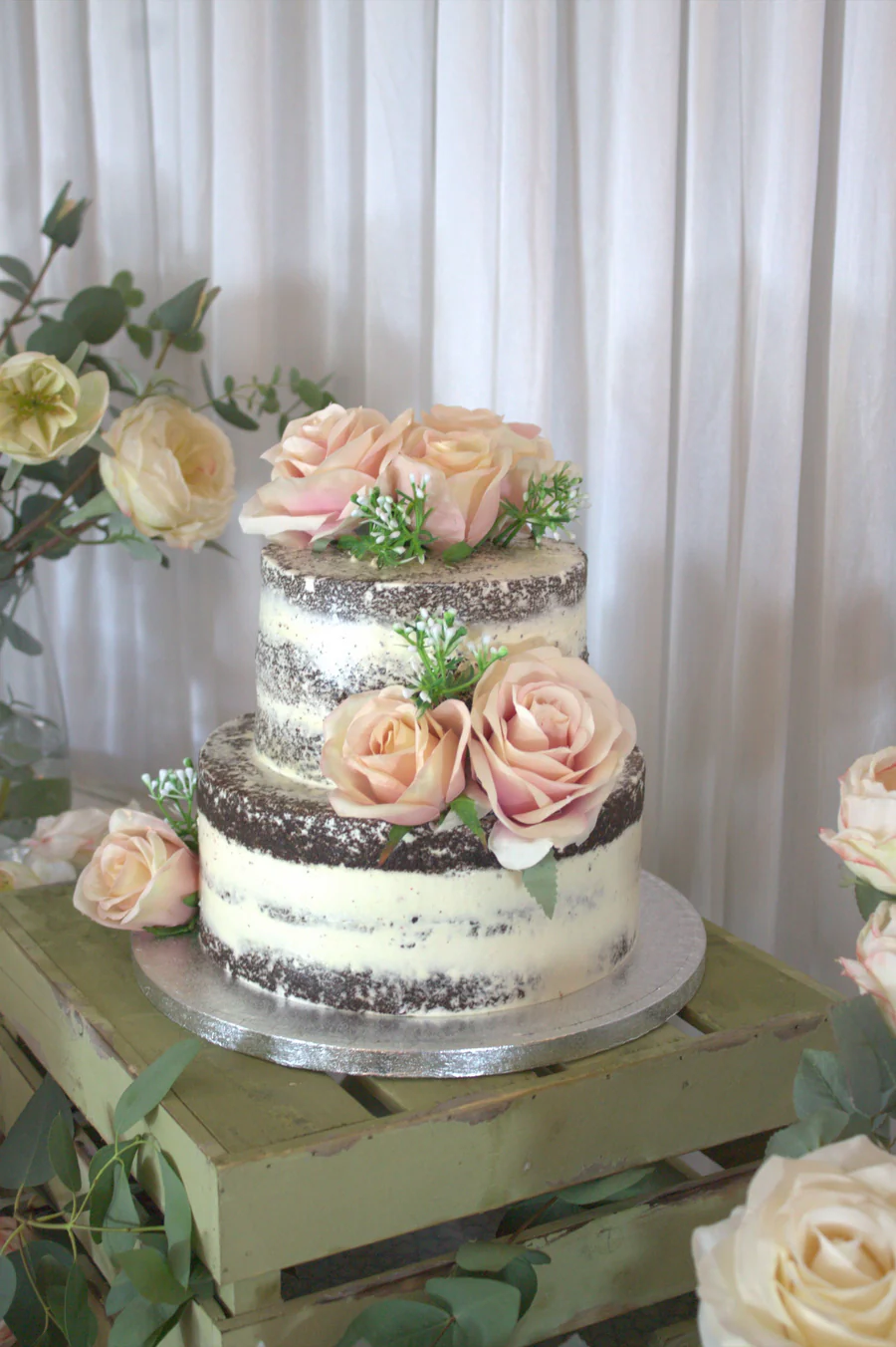 This is our iconic Two Tier Naked Chocolate with Vanilla wedding cake made from a soft fluffy sponge layered with pure frosting cream, layered homemade jam, and covered with frosting cream. This is an effortless and beautiful cake perfect for weddings, engagement parties or any other occasions.